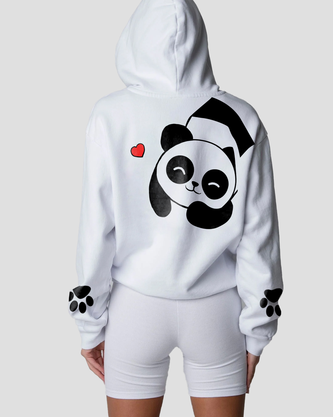 A soft and adorable hoodie featuring a sweet winking panda and cute paw-print sleeves. Perfect for panda lovers who want cozy comfort with a playful touch.