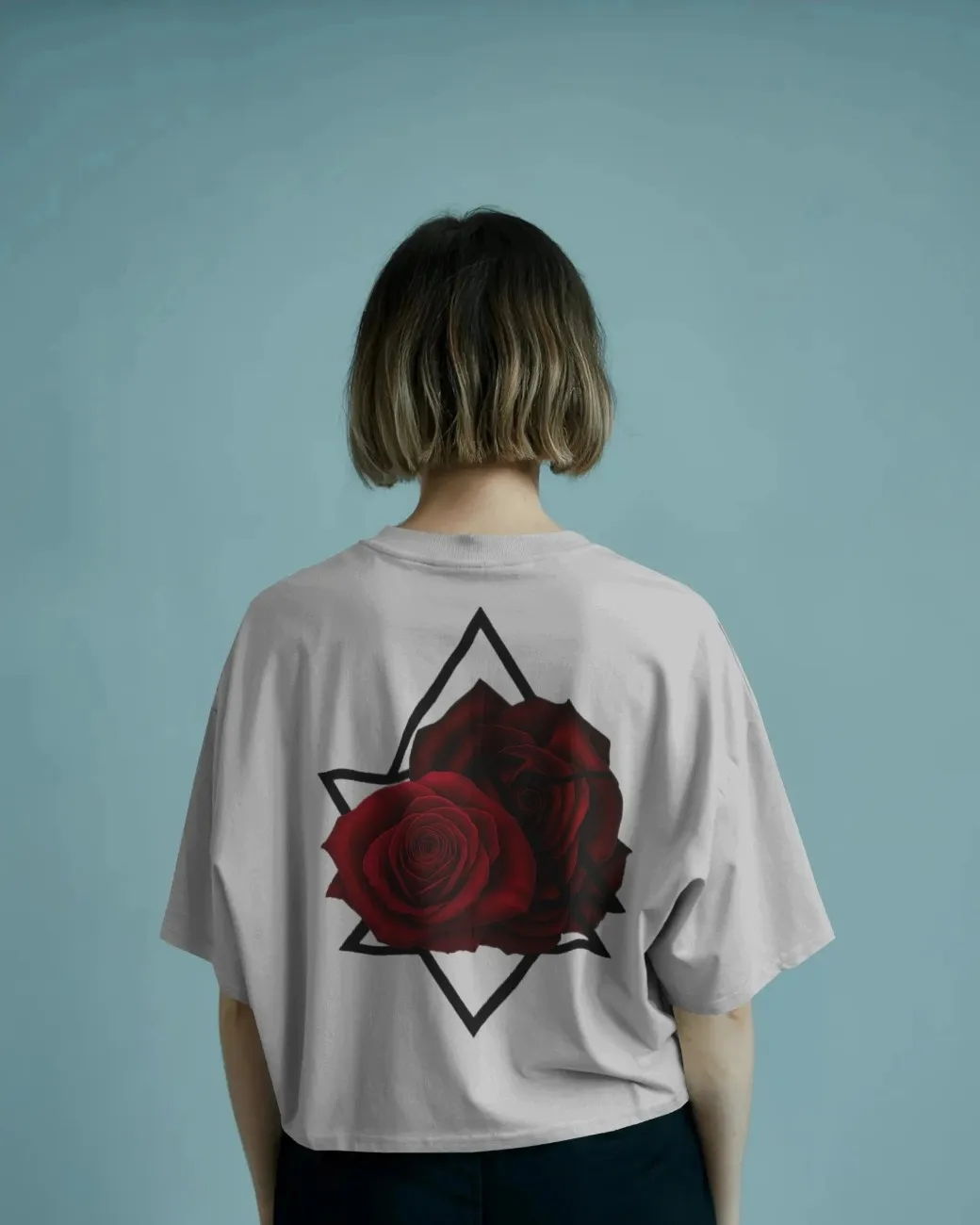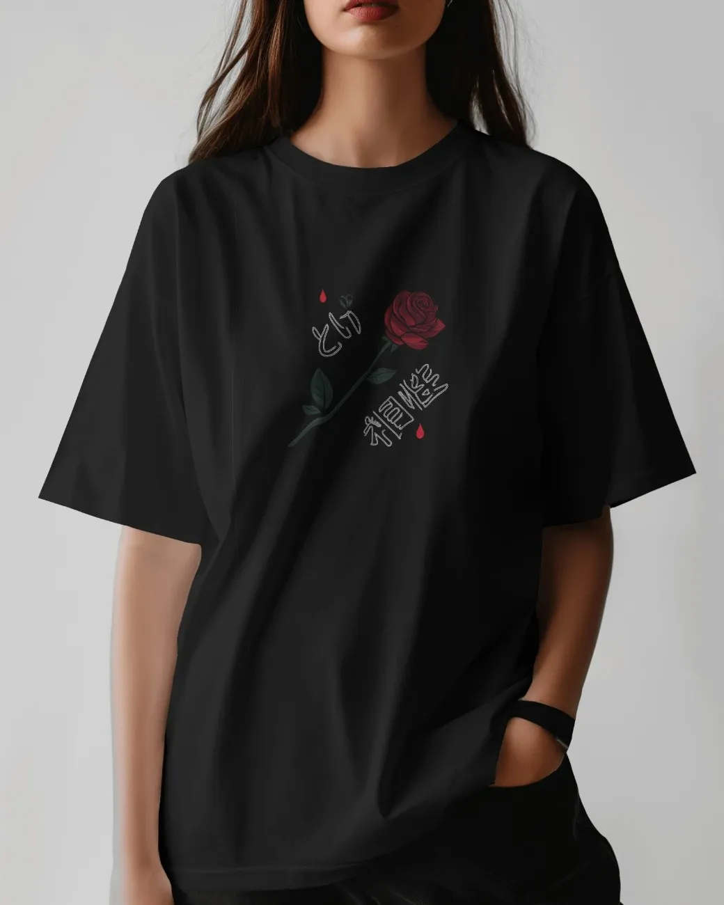 The Thorn & Bloom t-shirt is a bold fusion of delicate beauty and emotional depth. On the front, a blood-red rose pierces through the white fabric, accompanied by Japanese characters 「とげ」(thorn) and 「相鳴」(mutual resonance), symbolizing love, pain, and emotional connection. Drops of crimson hint at the cost of beauty.